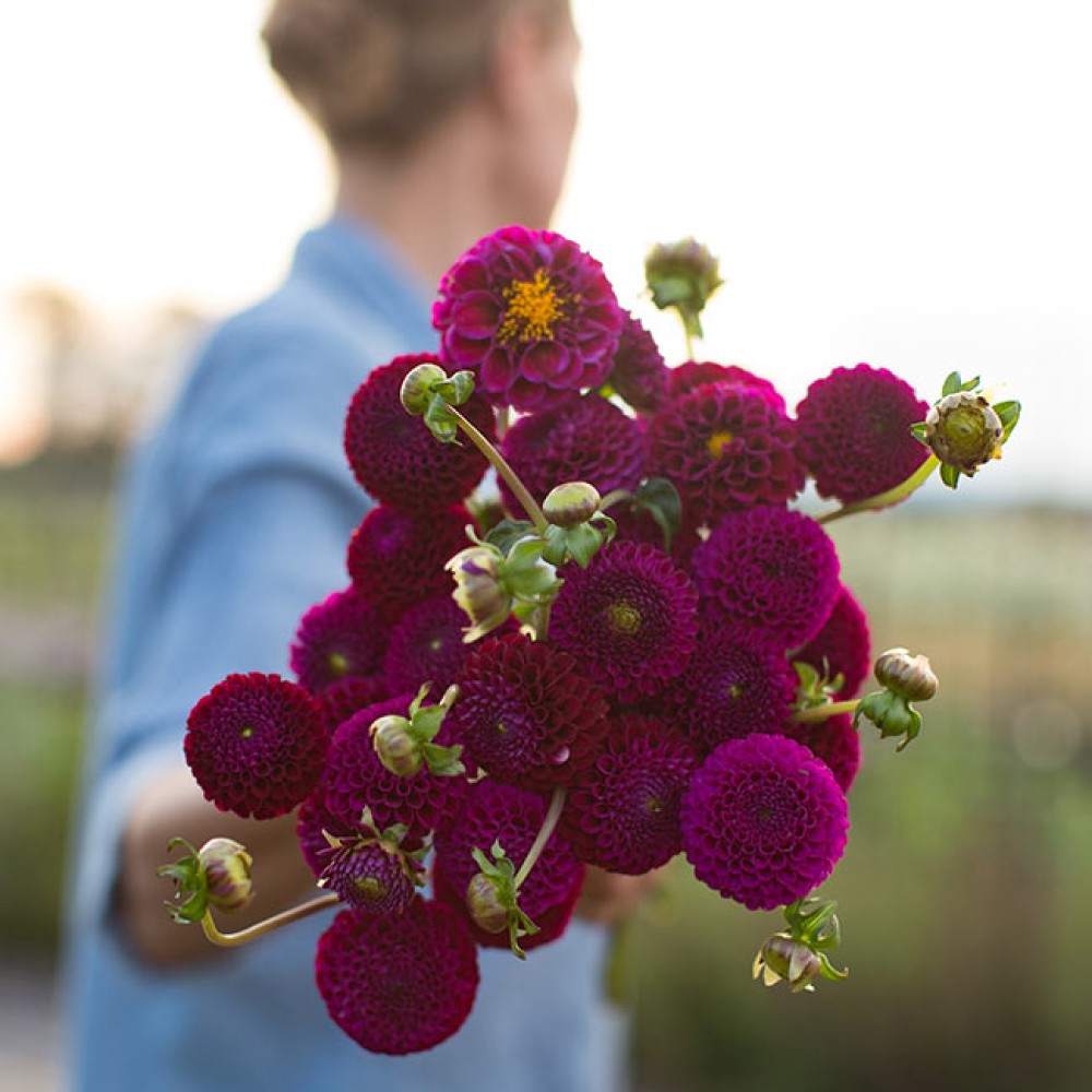 - Dahlia Pompon Rocco înflorește abundent și continuu.