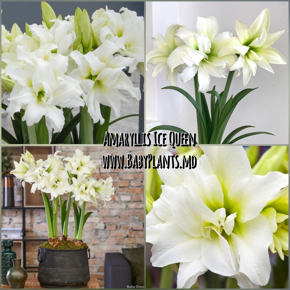 Amaryllis (Hippeastrum) provine din America de Sud, iar soiul "Ice Queen" a fost creat pentru a produce flori cu petale albe pure, ideale pentru compoziții elegante și stilate. Numele "Ice Queen" reflectă culoarea rece și pură a florilor, care seamănă cu o regină de gheață.