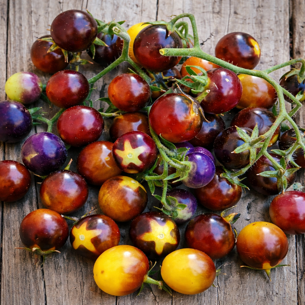 Fructele sunt mici, rotunde, cu greutatea de 10–20 g. Culoarea este neobișnuită și foarte decorativă — galbenă cu nuanțe violet-albăstrui și maronii, care apar mai intens la soare. Pulpa este suculentă, cu gust plăcut dulceag și o ușoară aciditate. Soiul este apreciat pentru culoarea spectaculoasă a fructelor, productivitatea ridicată și gustul bun.