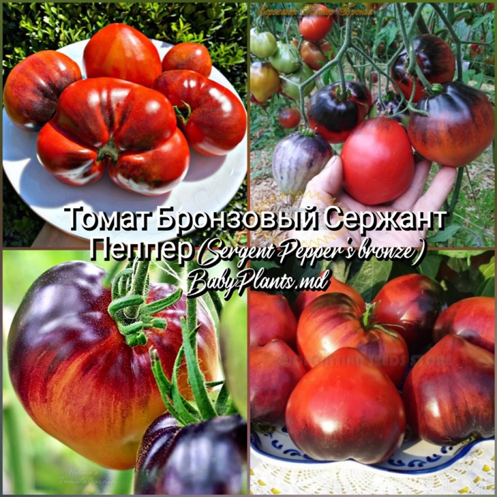 Бронзовый Сержант Пеппер (Sergent Pepper's bronze). Индет, среднеспелый. Плоды разной формы- сердцевидные, плоскоокруглые, овальные, цвет аналогичен с цветом Сержанта Пеппера, но с бронзовым отливом. Мякоть плотная, сочная, сбалансированного скуса, весом до 300г.