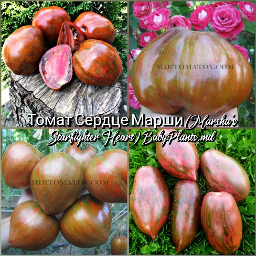 Сердце Марши (Marsha's Starfighter Heart). Одна из линий Проекта Звездных войн, которую ведет Марша Айзенберг. Сорт назван в ее честь. Индет, до 2м, среднеспелый. Плоды очень красивые, красно-коричневые с оливковыми фигурными линиями, разной формы- от пухлых сердец, до более удлиненных с характерным носиком, с плотной, сочной мякотью сладко-терпкого вкуса, бордового цвета, весом до 350г. Сорт невероятно урожаен, в кисти образует по 6-7 плодов. Один из лучших в этом сезоне. Рекомендую.