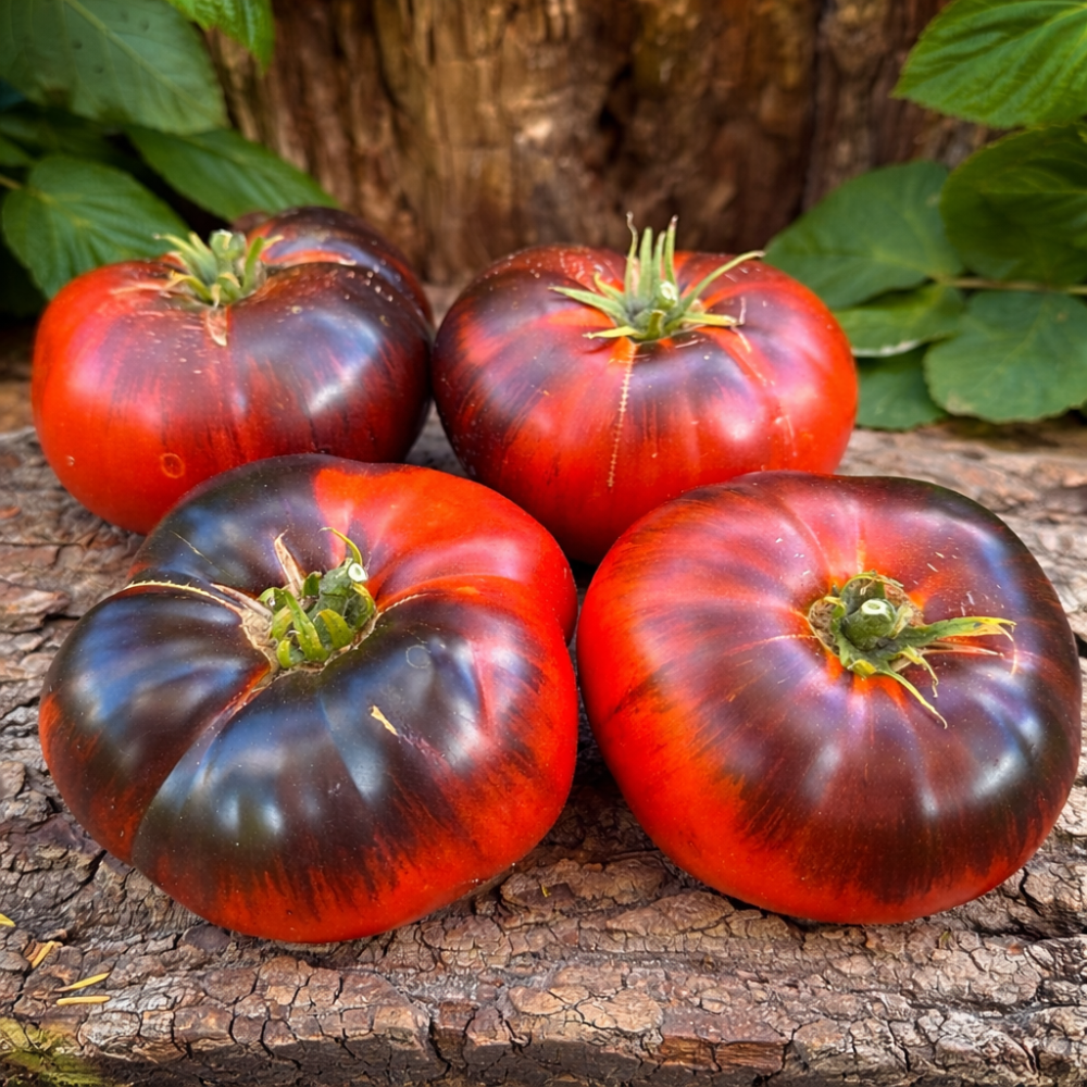 Soi semitardiv, nedeterminat, cu creștere viguroasă până la 1,5–1,8 m, necesită palisare și formare. Fructele sunt mari, turtit-rotunde, cu nervuri pronunțate, cântărind 200–450 g. Culoarea este vișiniu închis intens cu umeri antocianici caracteristici, suprafața lucioasă. Pulpa este densă, cărnoasă, suculentă, cu conținut ridicat de zaharuri și gust dulce echilibrat. Soiul oferă producții bune și fructificare stabilă atât în seră, cât și în câmp deschis pe terenuri bine luminate. Preferă soluri fertile, afânate și fertilizare regulată. Fructele sunt ideale pentru consum proaspăt, feliere decorativă și salate datorită culorii expresive și texturii dense. Se remarcă prin aspect decorativ ridicat și valoare colecționistică.