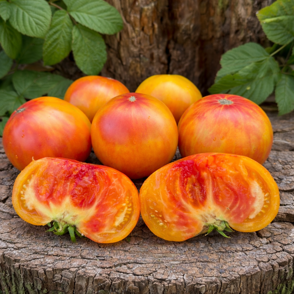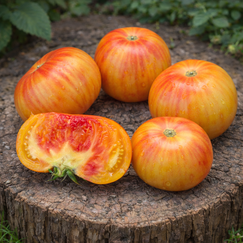 Fructele sunt mari, 300–400 g și mai mult, turtit-rotunde. Culoarea este bicoloră — portocaliu intens cu roșu. Pulpa este cărnoasă, marmorizată, cu puține semințe, cu gust dulce excelent și aromă pronunțată. Soiul este apreciat pentru aspectul decorativ, calitățile gustative și rezistența bună la boli. Potrivit pentru sere și câmp deschis, ideal pentru consum proaspăt și salate.