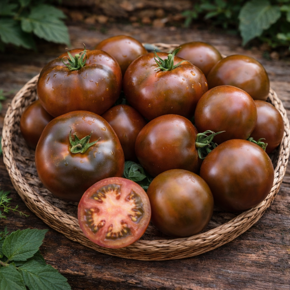 Soi de sezon mediu, cu creștere înaltă până la aproximativ 1,5–1,6 m, foarte productiv și cu fructificare stabilă. Fructele sunt perfect rotunde, uniforme, cu greutatea de 50–70 g, formate în ciorchini de câte 6 bucăți, care pot fi recoltate întregi. Culoarea este roșu-negru, cu partea inferioară brun-închisă și partea superioară mai intens colorată, oferind fructelor un aspect decorativ deosebit. Coaja este densă și elastică, pulpa cărnoasă și suculentă. Gustul este complex și bogat, cu aromă intensă de roșii și dulceață discretă, dar cu caracter gastronomic pronunțat. Soiul este potrivit pentru cultivare în seră și în câmp deschis pe terenuri bine luminate, preferă soluri fertile, afânate și fertilizare regulată. Utilizare universală — consum proaspăt, salate, conservare integrală și prezentare decorativă. Fructele suportă bine transportul și au aspect comercial atractiv.