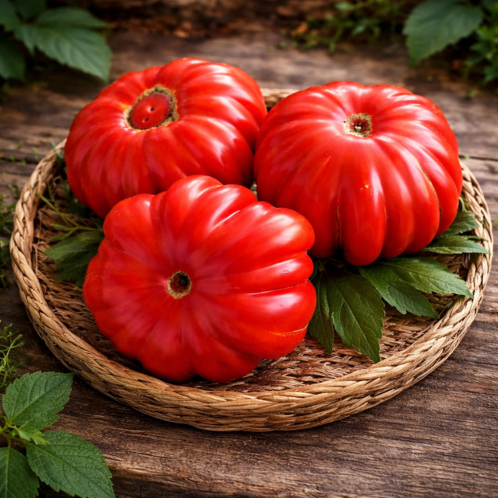 Soi de sezon mediu, cu creștere înaltă până la aproximativ 1,5 m, necesită palisare și formare. Fructele sunt mari, puternic costate, cu formă expresivă, cântărind aproximativ 300 g. Culoarea este intensă, în nuanțe închise profunde, oferind fructelor un aspect decorativ și colecționistic. Pulpa este densă, cărnoasă, cu pereți groși, suculentă și bogată în gust. Soiul se remarcă prin productivitate ridicată și fructificare stabilă atât în seră, cât și în câmp deschis pe terenuri bine luminate. Preferă soluri fertile, afânate și fertilizare regulată. Utilizare universală — excelent pentru consum proaspăt, salate, sosuri și procesare. Fructele își păstrează bine forma datorită structurii dense a pulpei. Apreciat pentru forma spectaculoasă, gustul bogat și randamentul ridicat.