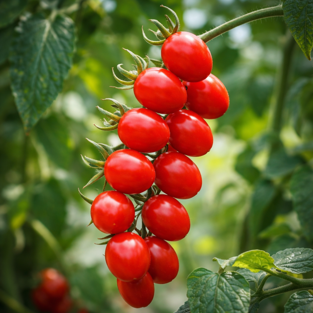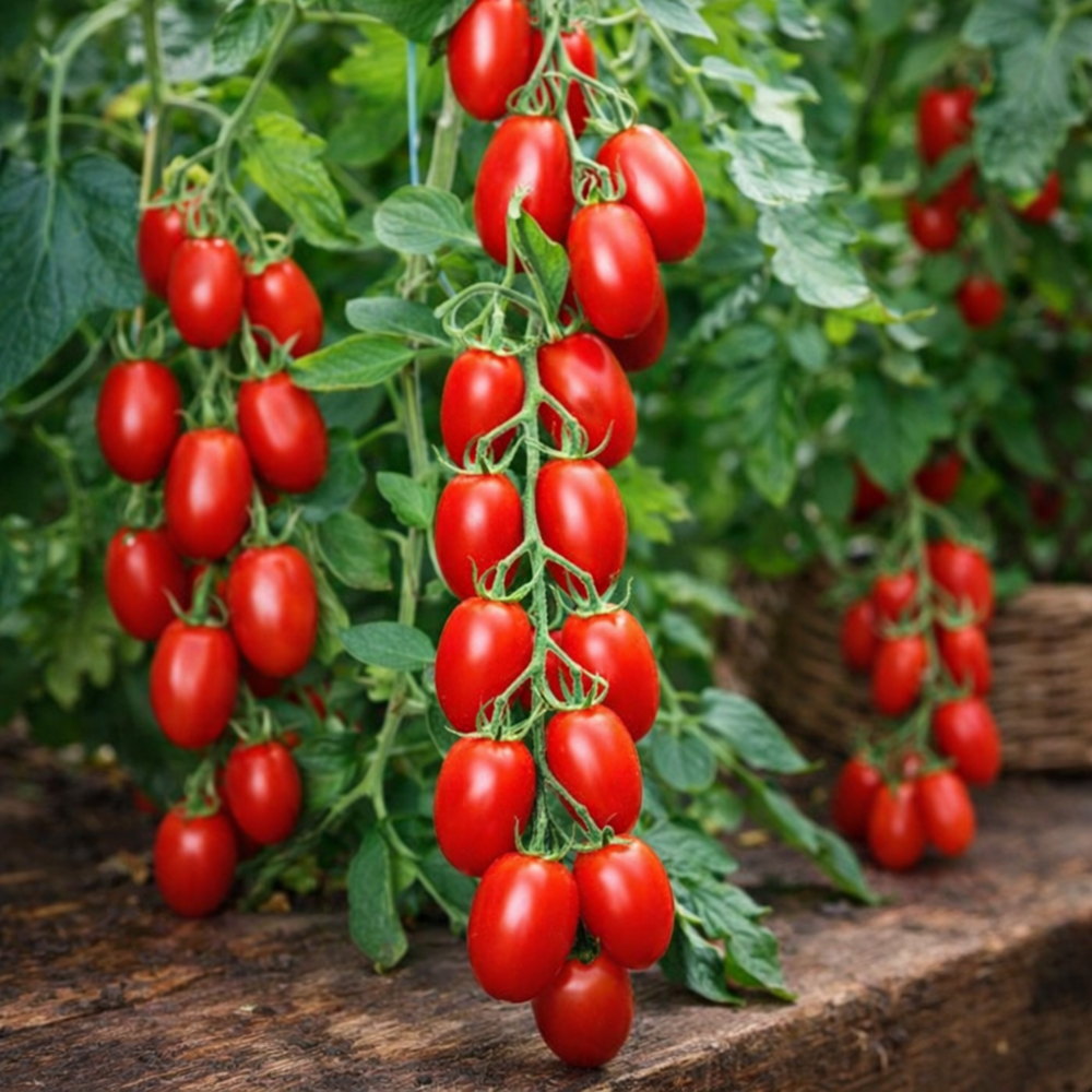 Soi timpuriu-mediu, cu creștere înaltă până la aproximativ 1,4–1,5 m, foarte productiv, cu frunziș compact de tip cartof. Fructele sunt mici, de formă pruniformă, cu greutatea de până la 20 g, de culoare roșu intens, lucioase, foarte dense și uniforme. Coaja este rezistentă, pulpa suculentă și crocantă la mușcare, caracteristică distinctivă a soiului. Gustul este dulce, bogat, cu aromă puternică și plăcută. Fructele se păstrează bine, sunt rezistente la crăpare și practic nu putrezesc. Soiul este potrivit pentru cultivare în seră și în câmp deschis pe terenuri bine luminate, oferind fructificare stabilă și de durată. Ideal pentru consum proaspăt, conservare integrală și prezentare decorativă datorită formei uniforme și luciului atractiv. Suportă bine transportul.
