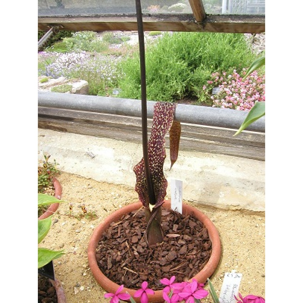 • Mod de plantare: Sauromatum venosum preferă locuri însorite sau semiumbrite, cu sol bogat și bine drenat. Bulbii se plantează la o adâncime de 10-15 cm, lăsând o distanță de 20-30 cm între plante.