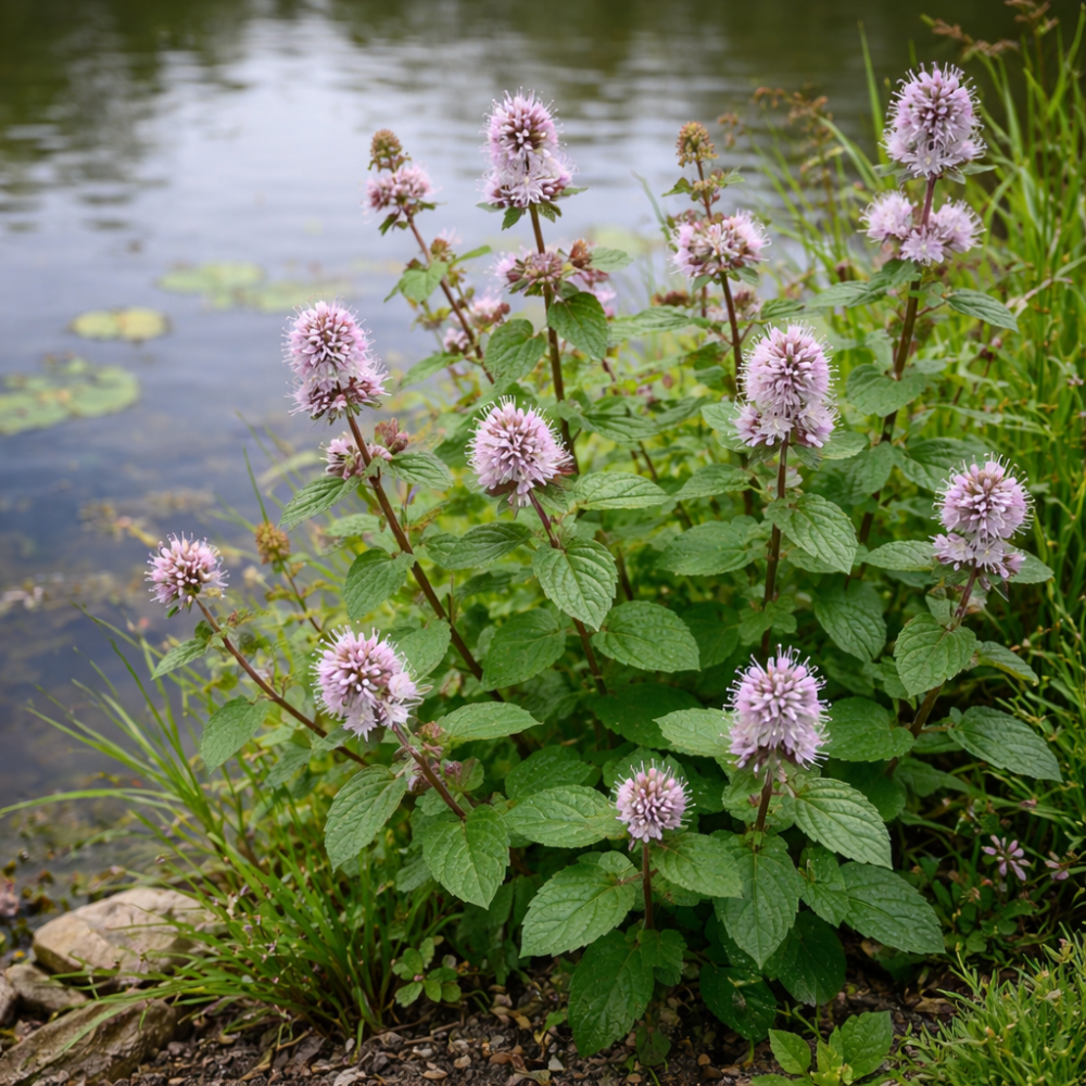 Mentha aquatica este o plantă perenă aromatică care crește în mod natural de-a lungul pâraielor, în zone mlăștinoase și pe soluri foarte umede. Planta formează tufe dense din lăstari ramificați și este apreciată pentru aroma puternică de mentă. Datorită aspectului decorativ și mirosului plăcut, menta de apă este cultivată ca plantă medicinală, aromatică și decorativă, fiind potrivită și pentru amenajarea zonelor umede din grădină.
