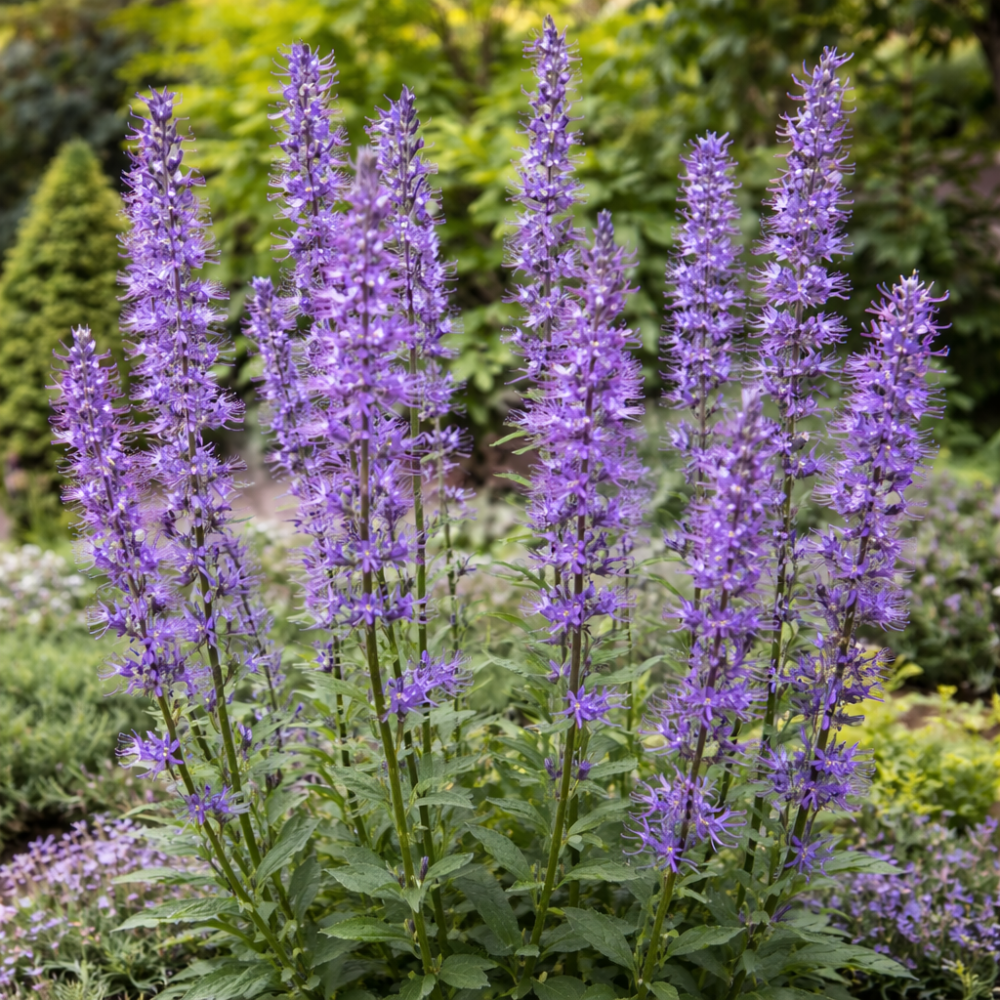 Înflorirea are loc din iunie până în august. Se integrează bine în grădini naturale, pajiști decorative și rocării, unde adaugă accente verticale interesante.