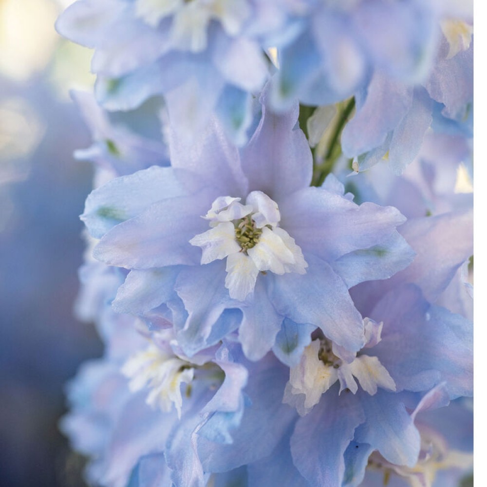Soi peren de delphinium, cu flori clasice de culoare albastru pal și centre albe contrastante. Inflorescențele sunt dense, de tip „lumânare”, cu flori bine umplute și internodii scurte, specifice seriei compacte Magic Fountains. Plantele sunt robuste, rezistente la vânt și formează tufe ordonate, atingând 90–120 cm înălțime. Potrivit pentru flori tăiate și straturi decorative; atrage albinele și fluturii.