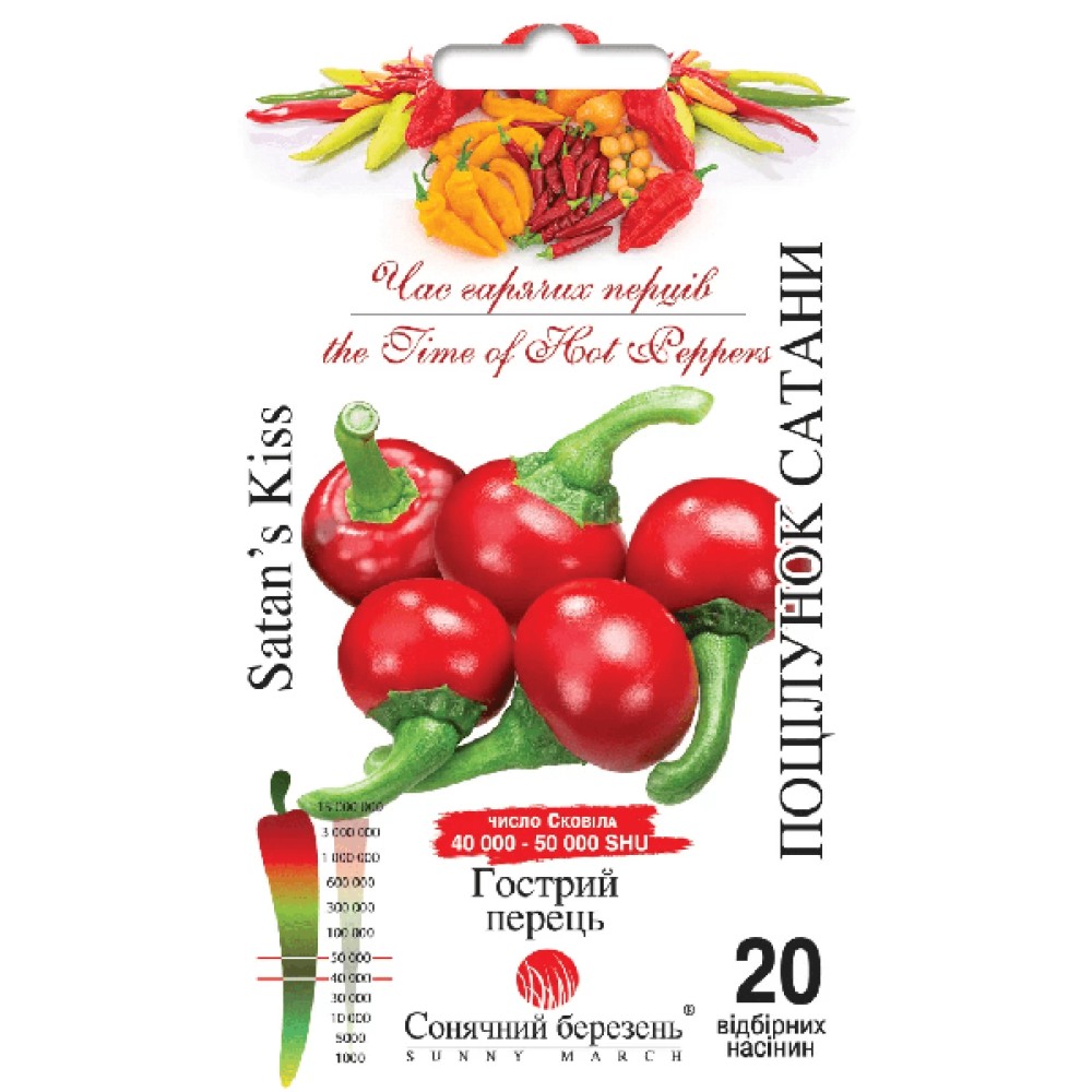 Довольно острый перец пеперончини из Южной Италии, известный под названием Baccio de Satana, Devil’s Kiss, Basicilica Ciliegia Piccante, Spicy Cherry, Satan’s Kiss, Ciliegia Piccante a Mazzetti. Он очень похож на маленький помидор или огромную вишню, диаметром от 1 до 2 дюйма (2,5-5 см) и созревают от зеленого до красного, постепенно набирая остроту и пряно-жгучий вкус. Растения компактной кустистой формы, хорошо облиственные, высотой до 40 см при выращивании на окне или балконе, и около 1 метра в открытом грунте и теплицах. Через 65 дней после всходов кусты увешаны красивыми гирляндами зеленых Черри, а через 85 дней они становятся ярко-красными. Перец Satan’s Kiss имеет очень игривый вид, он маленький и круглый, похожий на вишню, но его название должно дать Вам некоторое предупреждение о том, что за его симпатичным видом что-то скрыто. И действительно, этот старинный перец обладает мощной силой для своего размера, соперничая по остроте с кайенским перцем.