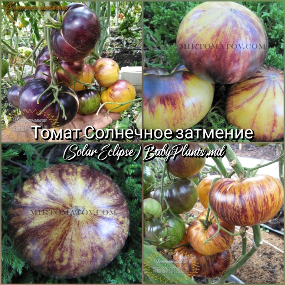 Солнечное затмение (Solar Eclipse). Новинка селекции. Оригинатор Жегалин Н.В. Высота до 2м, среднеспелый. Плоды плоскоокруглые, очень красивые- на желтом фоне фиолетово-коричневые полосы и штрихи, сливающиеся у плодоножки, сочные, нежные, очень вкусные, сладкие с фруктовыми нотками, весом 200-350г. Отличный высокоурожайный сорт, плодоносящий до поздней осени.