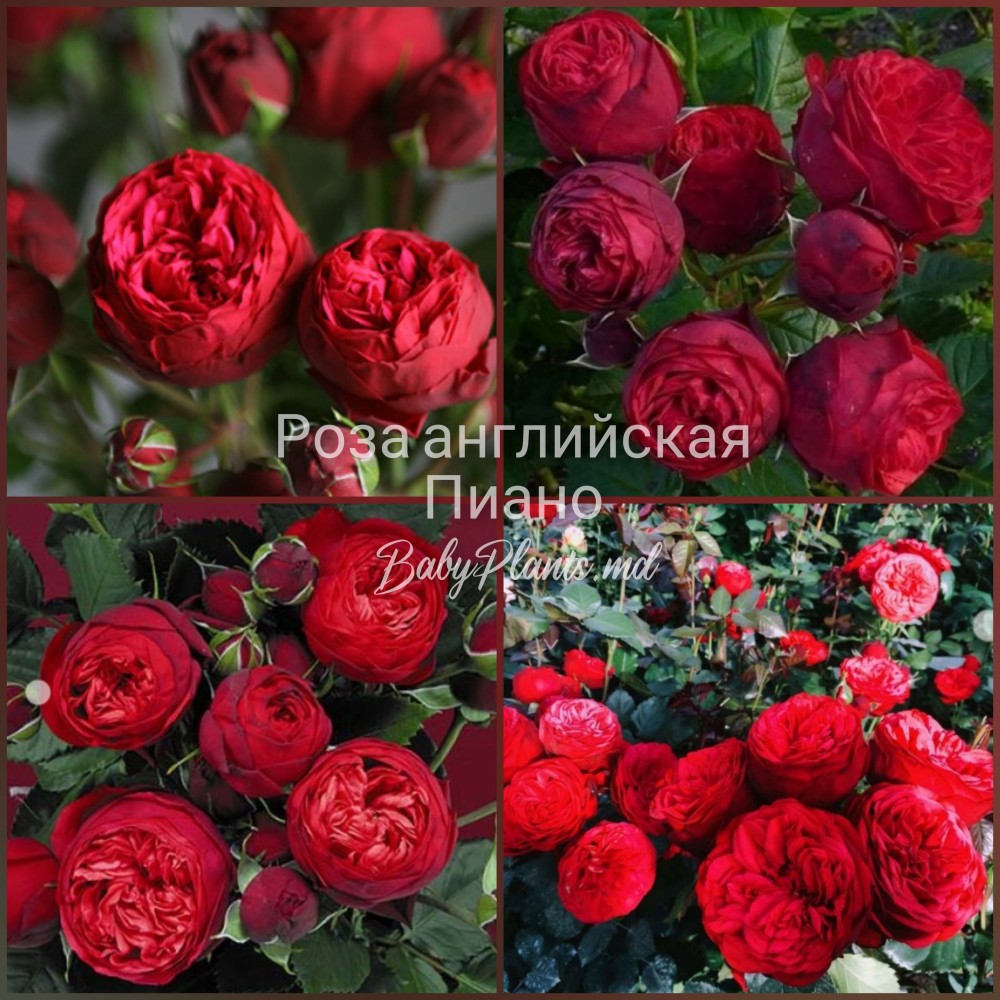 Роза английская Пиано (Piano) класс АА — неувядаемая классика цветоводства. Алые мини-букеты из 3-8 цветков словно светятся на фоне изумрудной блестящей листвы. Сочетание старинной формы бутона и тонкого малинового аромата волнуют воображение. Распускаясь, пионовидные розы меняют форму — с округлой до чашевидной, с плотной структурой волнистых лепестков. Эти розы достойны сиять в Вашем саду.